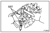 NOTICE: Install the same part in the same combination to the original locations. (b) Using SST, compress the valve spring and place the 2 keepers around the valve stem.